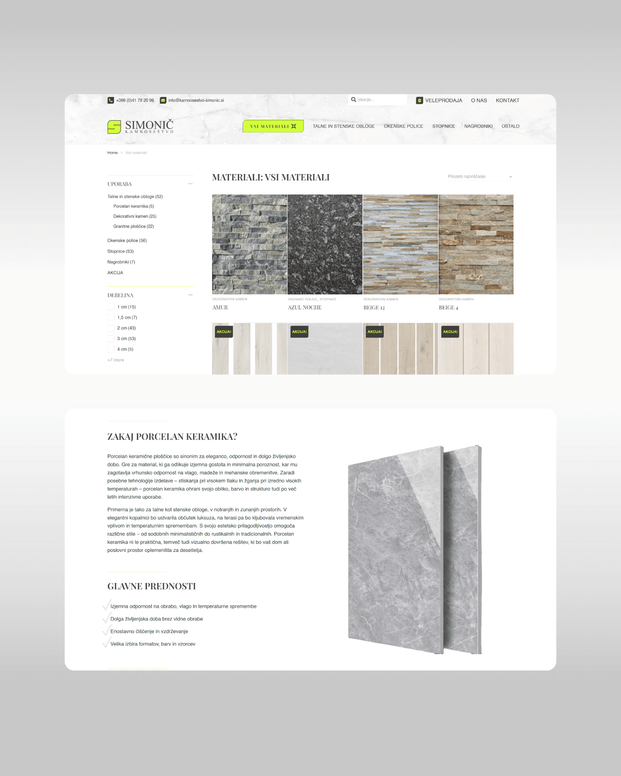 Poleg izboljšane navigacije smo poskrbeli tudi za jasno in logično predstavitev celotne ponudbe ter celostno predstavitev posameznih materialov. Vsak material je zbran na enem mestu skupaj s tehničnimi informacijami, opisom lastnosti in kakovostnimi fotografijami, kar uporabnikom omogoča informirano odločanje brez dodatnega iskanja ali poizvedovanja. Velik poudarek smo namenili tudi profesionalni foto in video vsebini, ki avtentično prikaže kakovost izdelave in obdelave kamna.