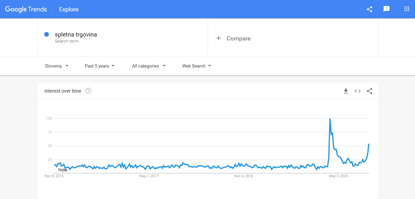 Poznate orodje Google Trends? Podatki v Google Trendih odražajo iskanja, ki jih ljudje opravijo v Googlu v določenem obdobju. Na sliki zgoraj lahko vidite kako drastično se je dvignil trend iskanj ključne besede “spletna trgovina”. Kar pa je že samo po sebi dovolj zgovorno. Torej, kaj še čakate?