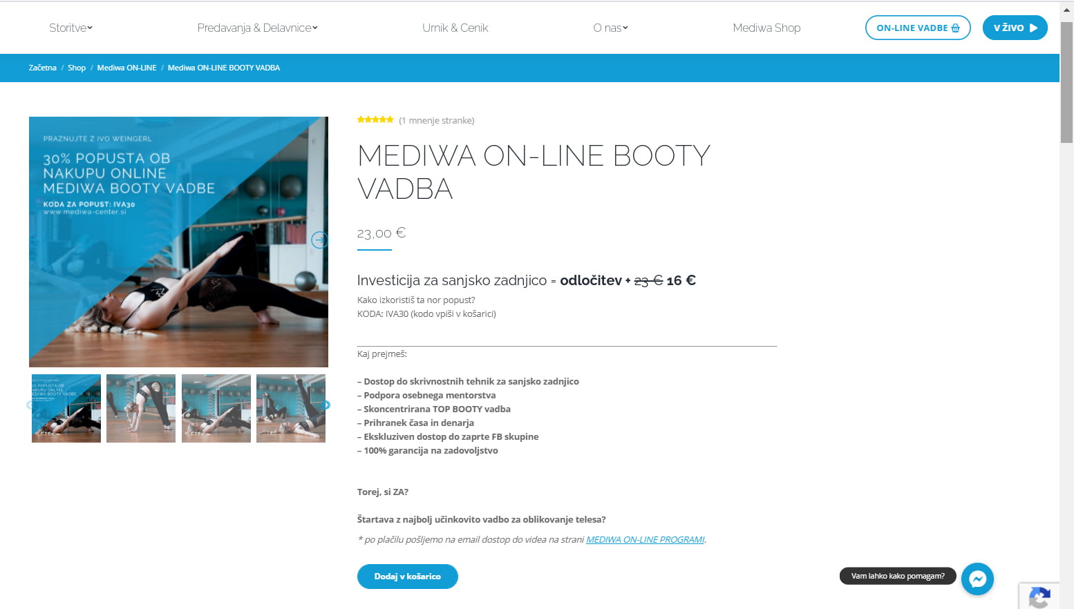 Na sliki je prikazan del spletne trgovine Mediwa Centra. Gre za on-line program ene izmed vadb. Prav tako pa smo omogočili zakup vadb, ki potekajo V ŽIVO.