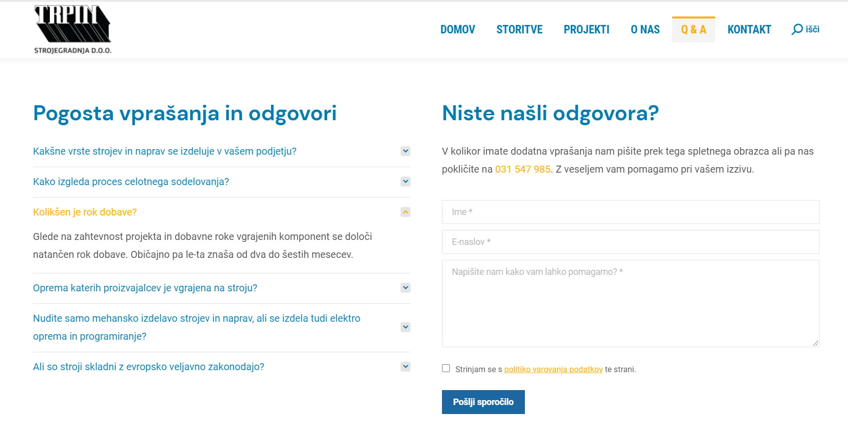Primer podjetja Trpin Strojegradnja, kjer smo predlagali umestitev pogostih vprašanj in odgovorov ob kontaktnem obrazcu. To so te detajli, ki peljejo do boljše uporabniške izkušnje in optimizacije prodajnih procesov.